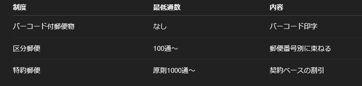 郵便局の「バーコード割引」は、法人や事業者が一定条件(バーコード付郵便物、区分郵便物など)で郵便物を差し出す場合に適用されるもので、3%程度の料金割引が基本ですが、送付数や条件に応じて割引率は変わります。