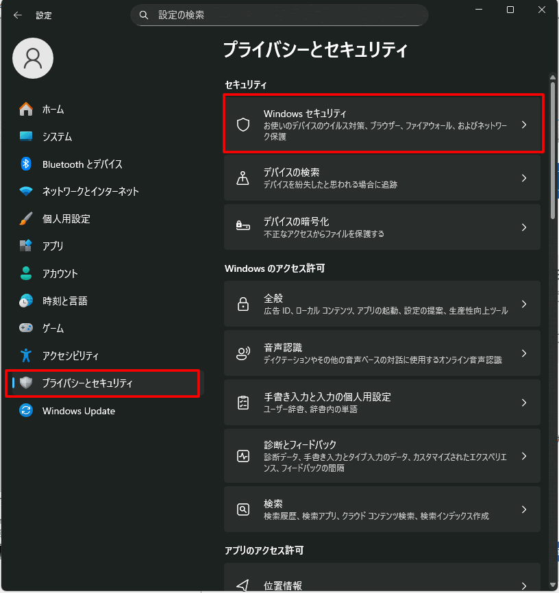 設定 → プライバシーとセキュリティ → Windows セキュリティ