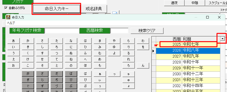 「寛永七年」の場合、「か」「ん」「え」「い」と入力して、右側の該当行(寛永七年)をクリックして下部の和暦欄に正しく入力されていることを確認してから、月日を入力して「決定」ボタンをクリックしてください。