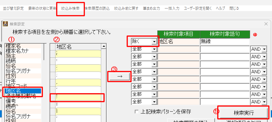 (6)「全部」を「除く」に変えて「検索実行」をクリックして下さい。