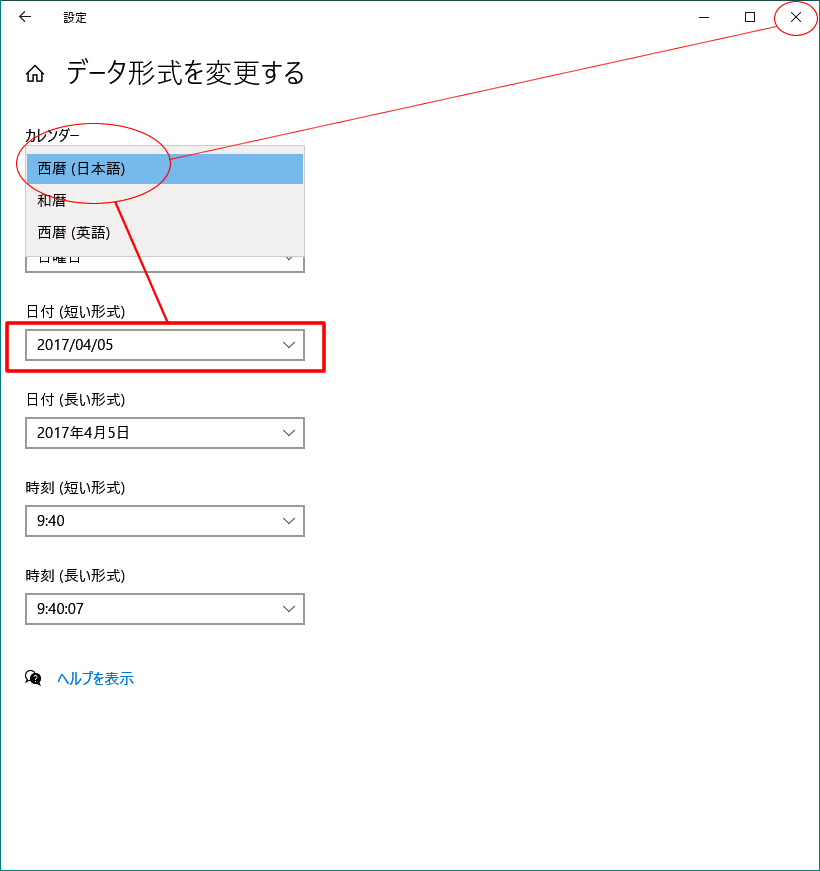 (3)カレンダーを「西暦(日本語)」に変更して閉じてください。