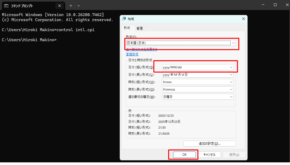④ 「地域」の画面が出たら「形式の変更」の「短い日付」を yyyy/MM/dd に直してください。OK を押して閉じて頂けたら OKです。